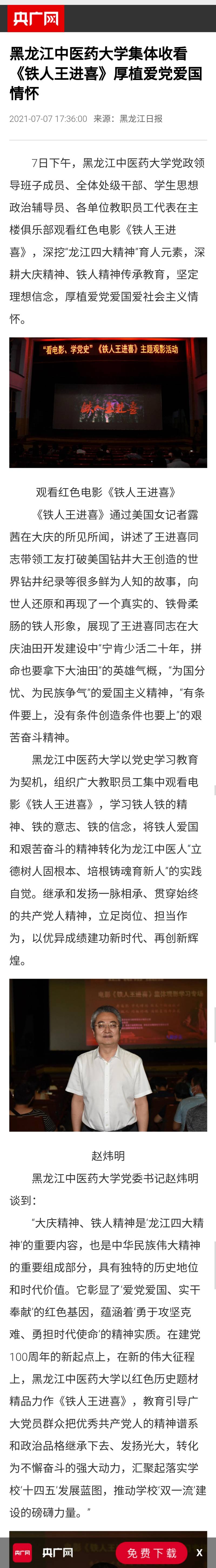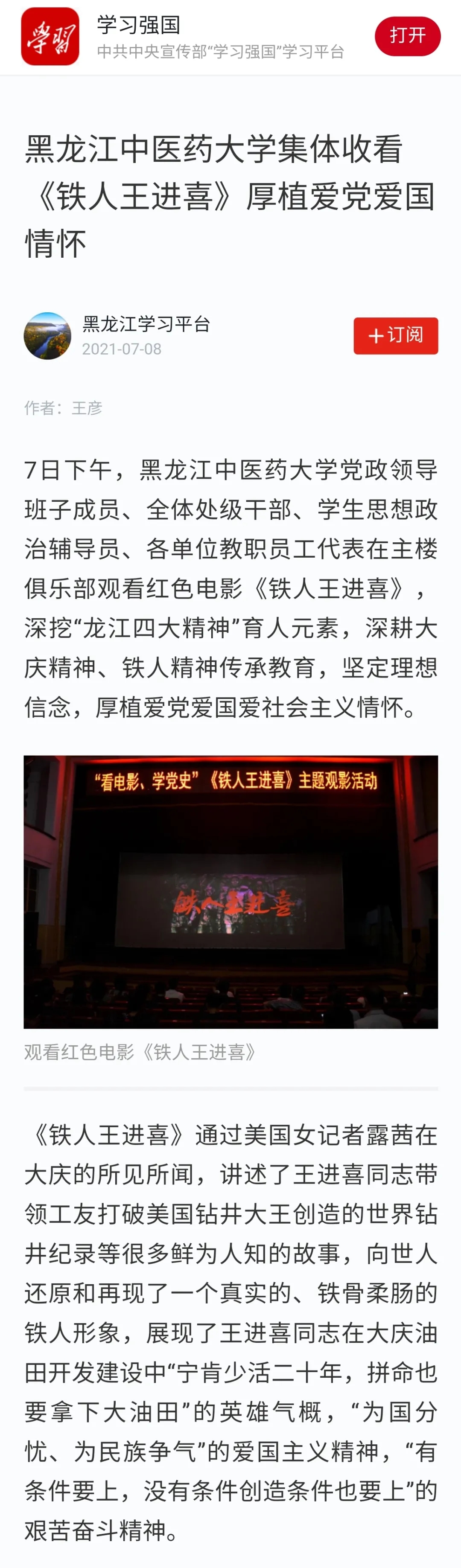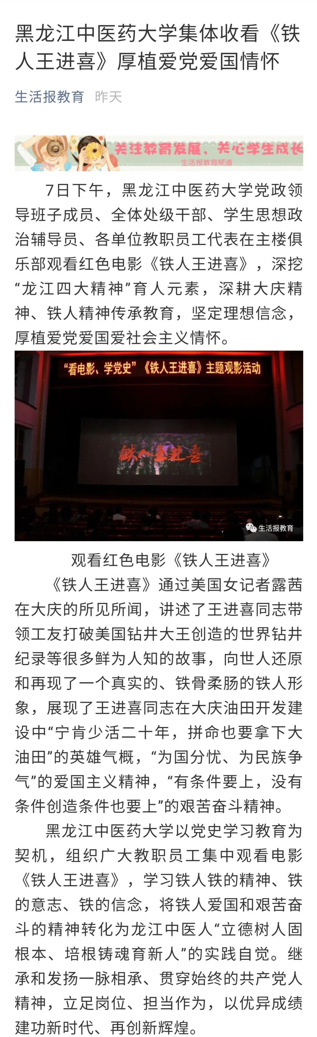 央广网、生活报、学习强国报道:黑龙江中医药大学集体收看《铁人王进喜》厚植爱党爱国情怀