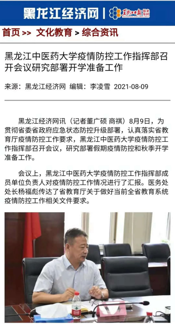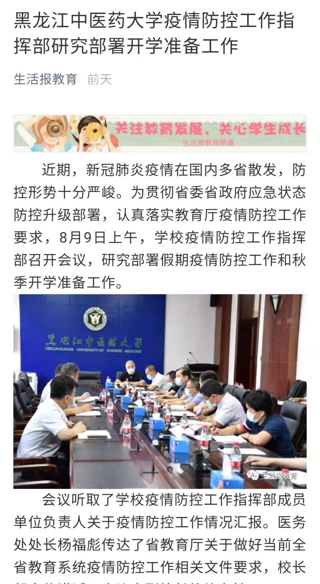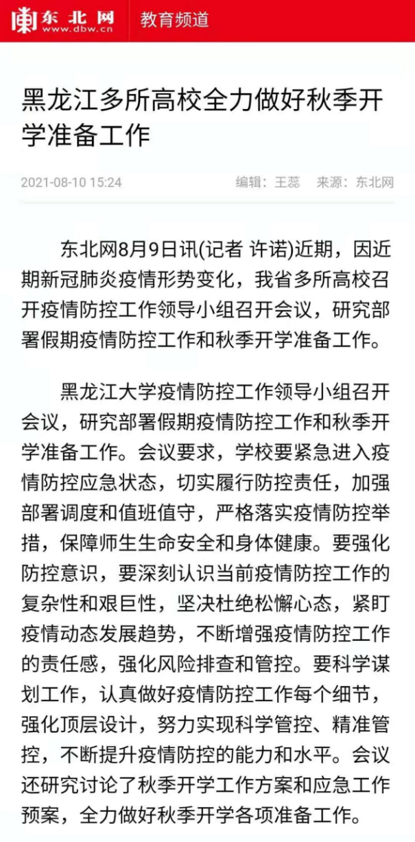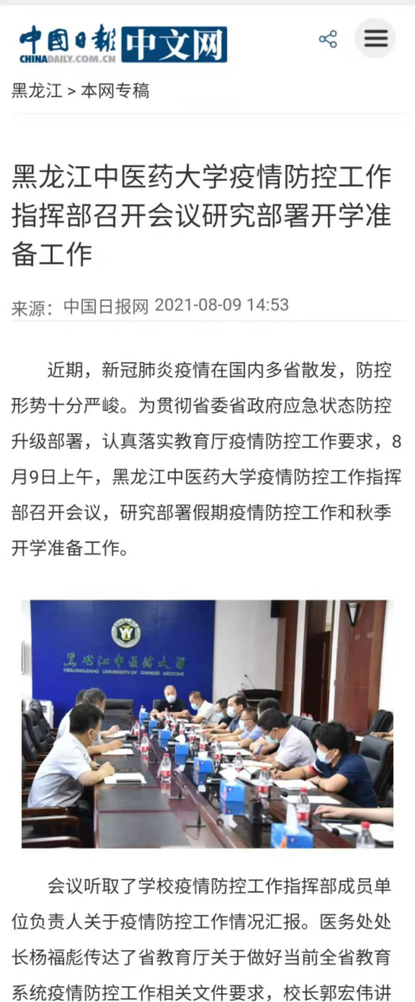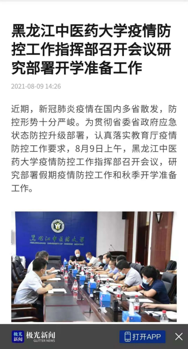为贯彻省委省政府应急状态防控升级部署,认真落实教育厅疫情防控工作要求,8月9日上午,我校疫情防控工作指挥部召开会议,研究部署假期疫情防控工作和秋季开学准备工作。我校相关工作得到央广网、中新网、 东北网、中国日报、极光新闻、生活报、黑龙江经济网、香港商报、网易新闻、港媒看龙江、新浪新闻等11家媒体的关注和报道。