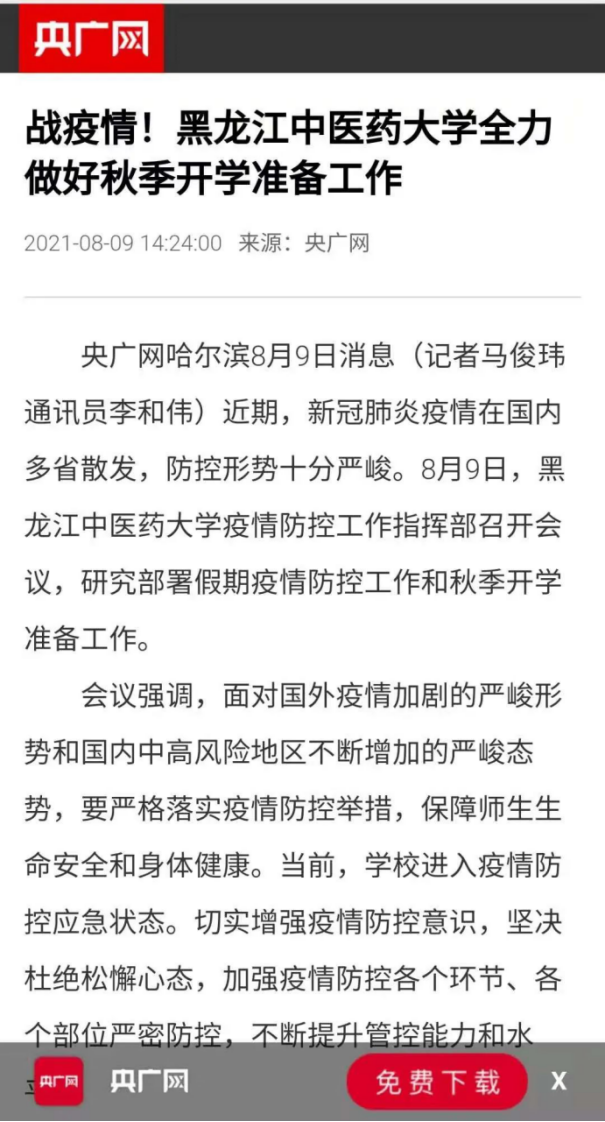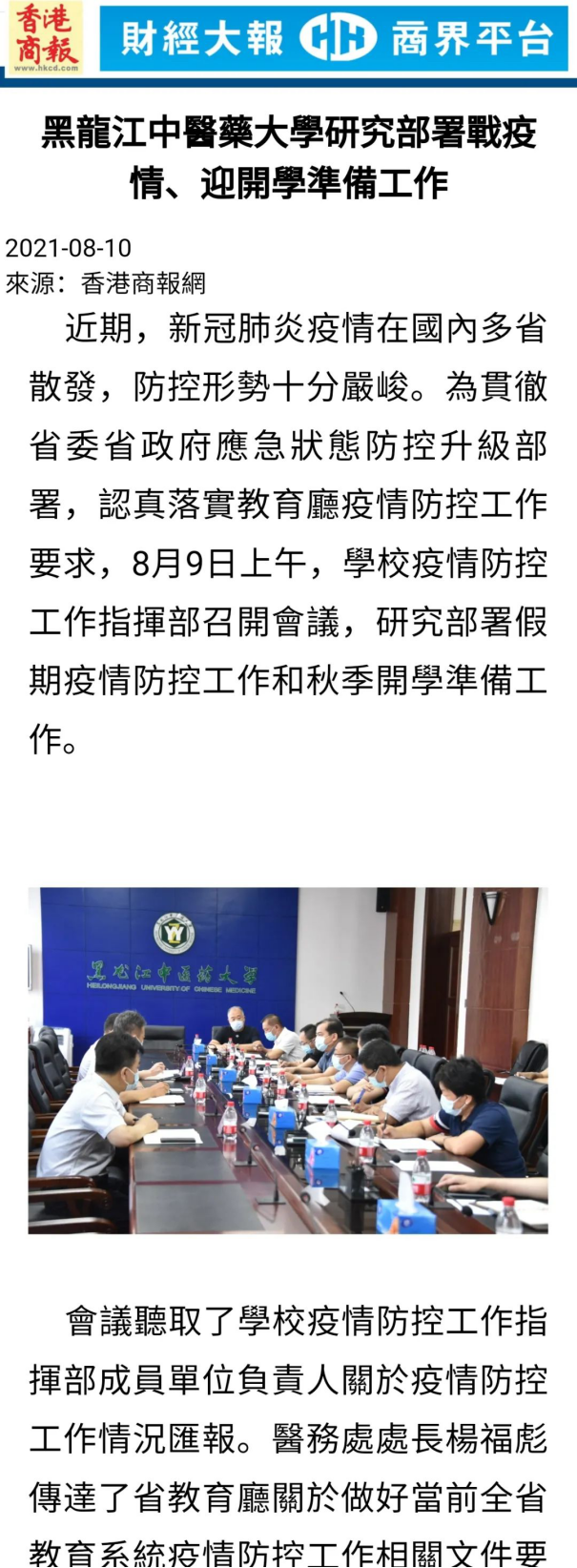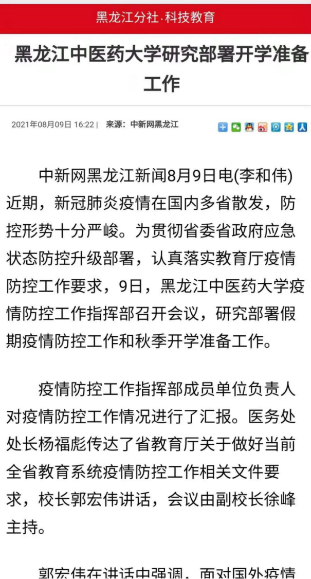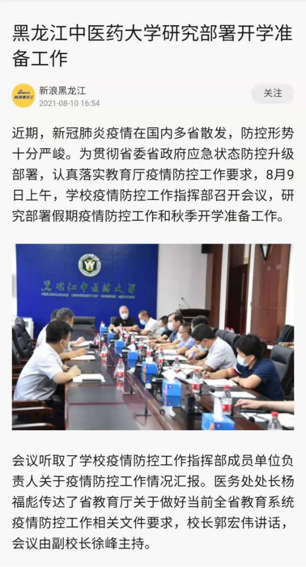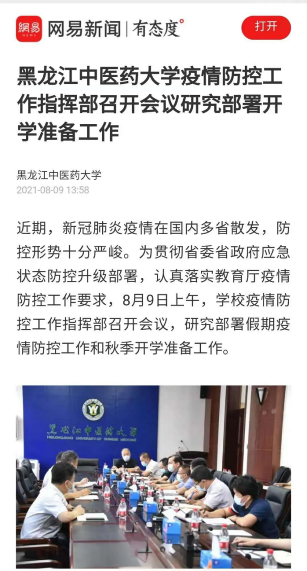 为贯彻省委省政府应急状态防控升级部署,认真落实教育厅疫情防控工作要求,8月9日上午,我校疫情防控工作指挥部召开会议,研究部署假期疫情防控工作和秋季开学准备工作。我校相关工作得到央广网、中新网、 东北网、中国日报、极光新闻、生活报、黑龙江经济网、香港商报、网易新闻、港媒看龙江、新浪新闻等11家媒体的关注和报道。
