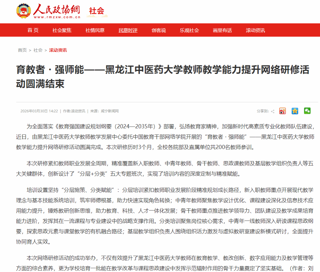 为深入学习贯彻党的二十大和二十届历次全会精神,全面落实《教育强国建设规划纲要(2024—2035年)》部署,弘扬教育家精神,加强新时代高素质专业化教师队伍建设,学校教师教学发展中心联合中国教育干部网络学院开展的“育教者・强师能”——黑龙江中医药大学教师教学能力提升网络研修活动近期完成。