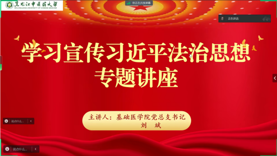 11月30日,医学院通过腾讯会议线上开展“深入学习宣传习近平法治思想”专题讲座。基础医学院党总支书记刘斌就习近平法治思想的重大意义等六个模块,为全院教职工作专题辅导。