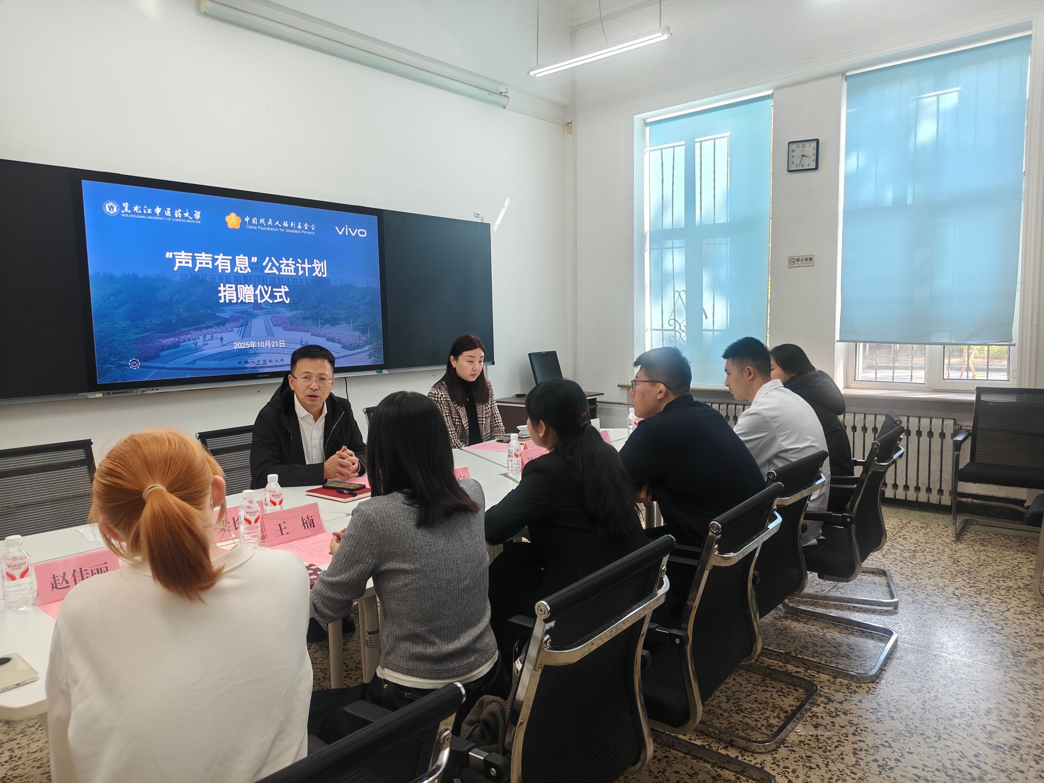 10月21日下午,“声声有息”公益计划捐赠仪式在主楼105室顺利举行。黑龙江省残疾人福利基金会副秘书长傅海涛和财务部负责人胡晓玲出席活动,学生工作部副部长白宇、相关辅导员及受助学生参加仪式。