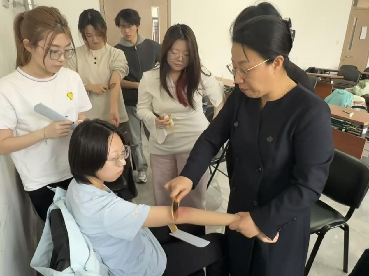 王淑荣将与中医特色融入活动,从中医“气血调和、身心同源”的理念出发,详细讲解了刮痧的原理、操作手法及注意事项,重点示范了颈部、头部等易缓解压力、疏通气血部位的刮痧技巧,手把手指导同学们掌握力度与角度,体会气血通畅带来的身心舒缓。