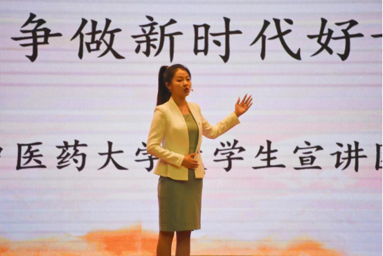 科技创新竞赛国家级奖项获得者、研究生院2022级硕士第一党支部学生党员、2022级方剂学专业高鑫同学以《高举中国特色社会主义伟大旗帜,争做新时代好青年》为题作宣讲报告。