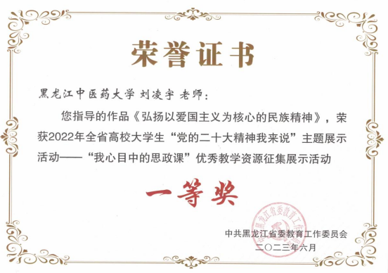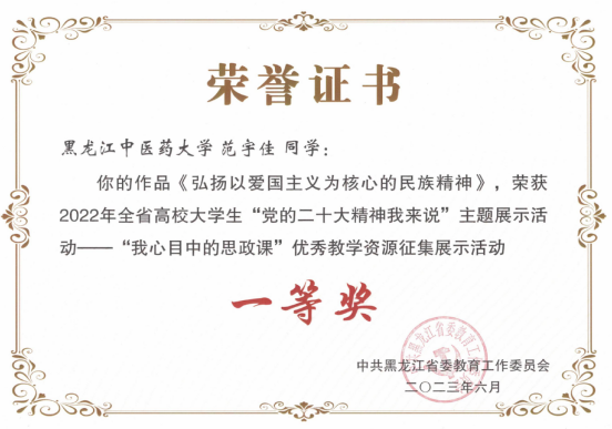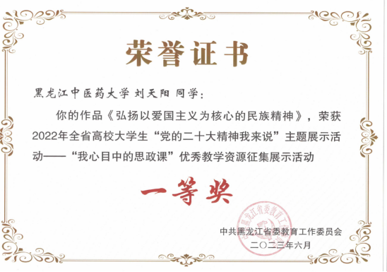 由省委教育工委主办的2022年全省高校大学生“党的二十大精神我来说”主题展示活动评选结果日前揭晓,由我校马克思主义学院组织策划,思政课教师刘凌宇指导,2020级运动康复专业刘天阳、2019级针灸推拿学专业范宇佳两位同学完成的作品《弘扬以爱国主义为核心的民族精神》,以第一名的成绩荣获“我心中的思政课”优秀教学资源征集展示活动一等奖。