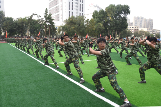 在军训成果汇报表演中,2023级新生代表分别表演了男子军体拳、女子匕首操、对抗战术及医疗救护。随后,承训教官也展示了精湛的军事技能。