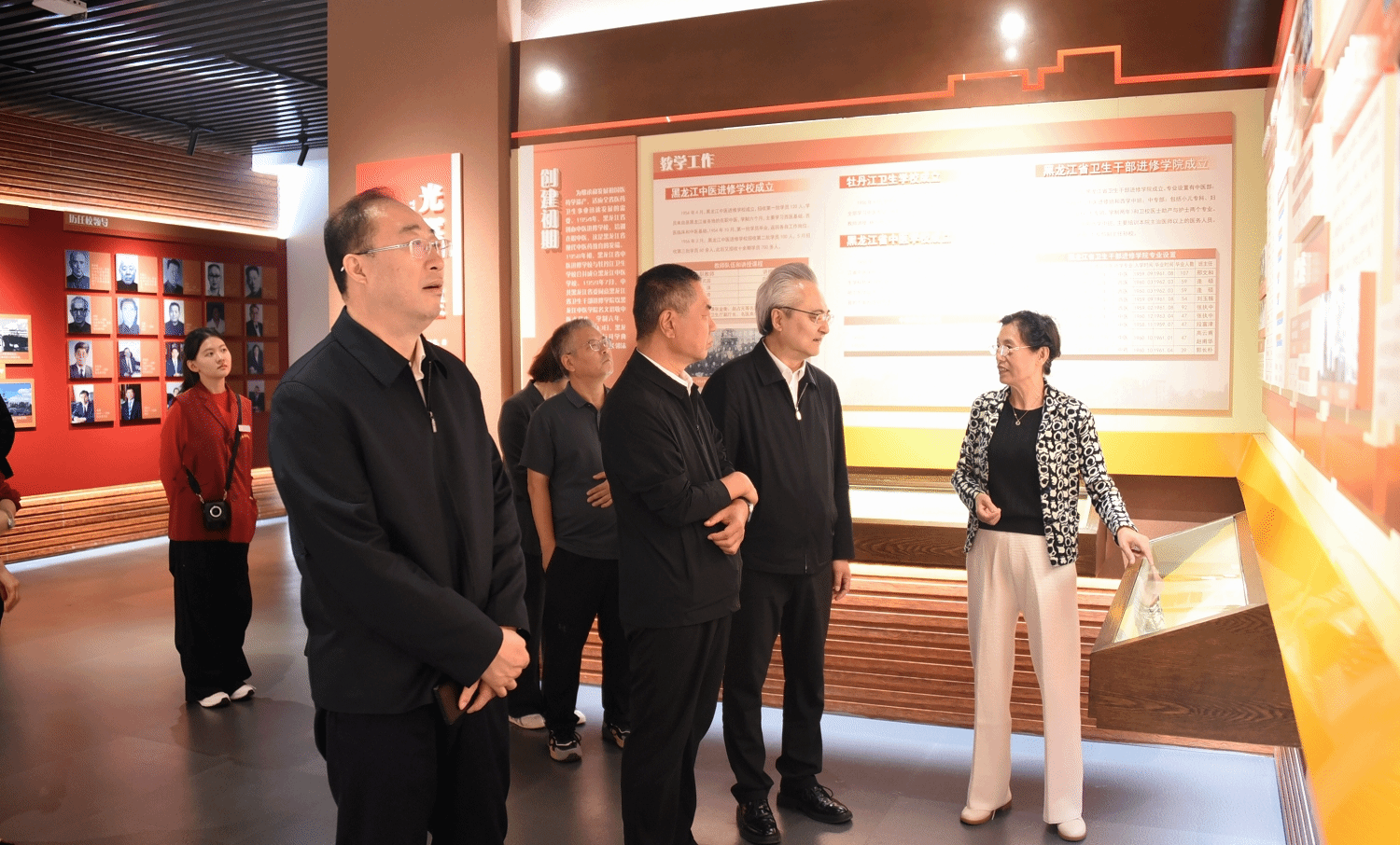 座谈会后,于志伟一行还实地考察了学校文化设施、离退休干部活动中心及中医药博物馆,与正在活动的离休干部亲切交流,并在退休干部志愿者的讲解下参观了黑龙江中医药大学校史馆,详细了解学校发展历程及老干部工作、老年教育相关硬件建设情况。