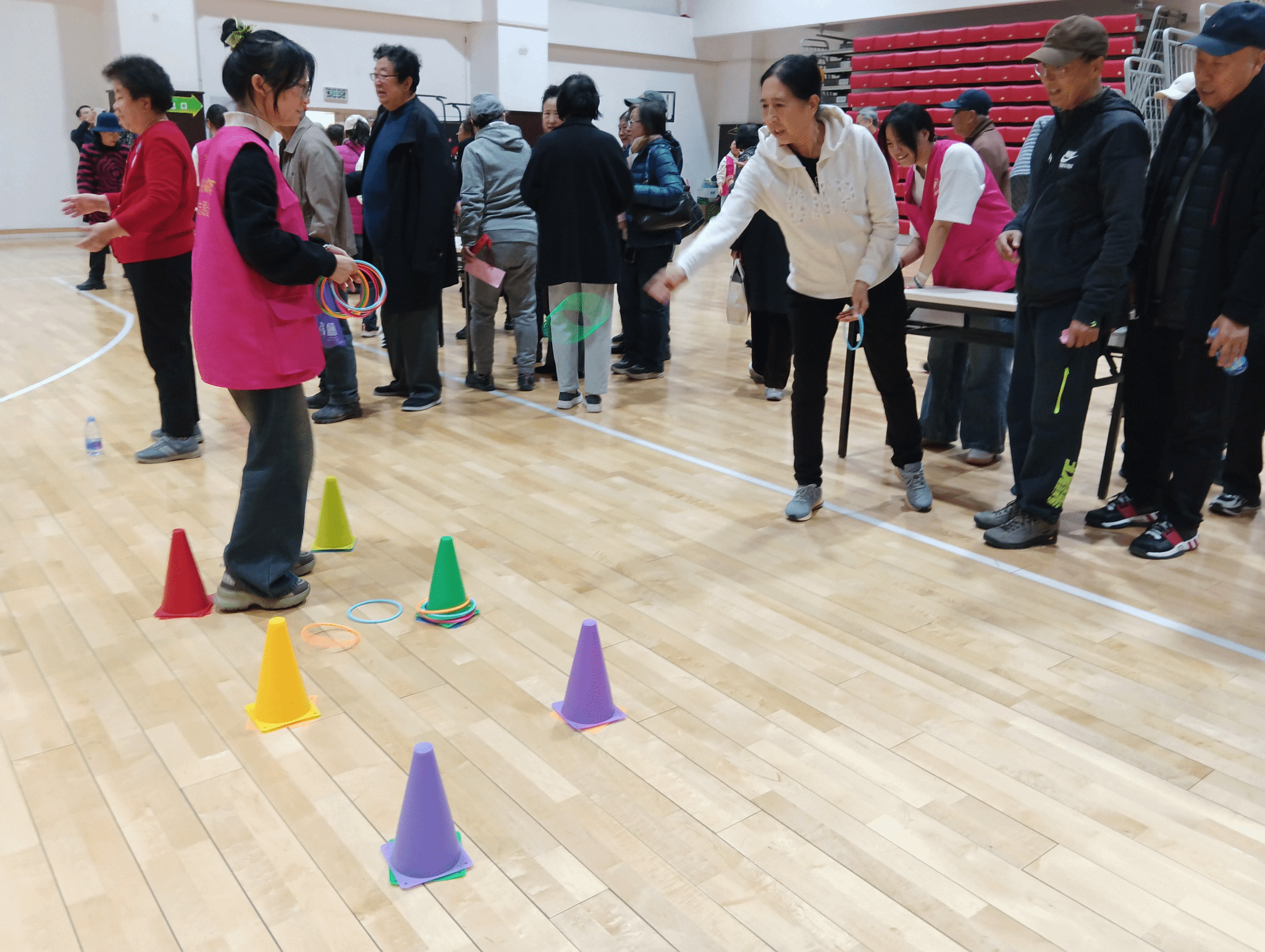 离退休工作处人员和青年志愿者在赛前布置好场地,营造浓厚重阳节节日气氛。本次趣味运动会充分考虑老同志们的身体特点和兴趣爱好,设置了套圈游戏、筷子夹豆子、“保龄球”大作战、记忆比拼、丢沙包等集趣味性、安全性于一体的比赛项目。