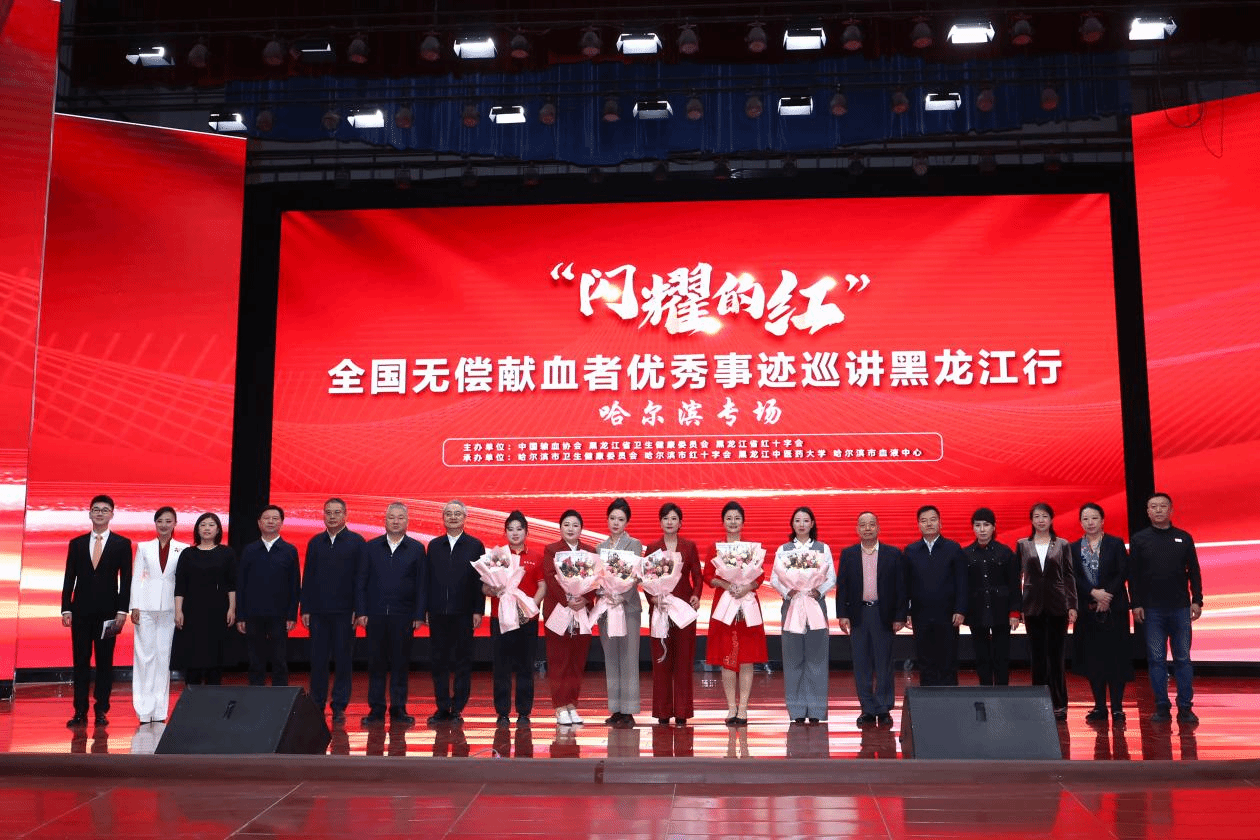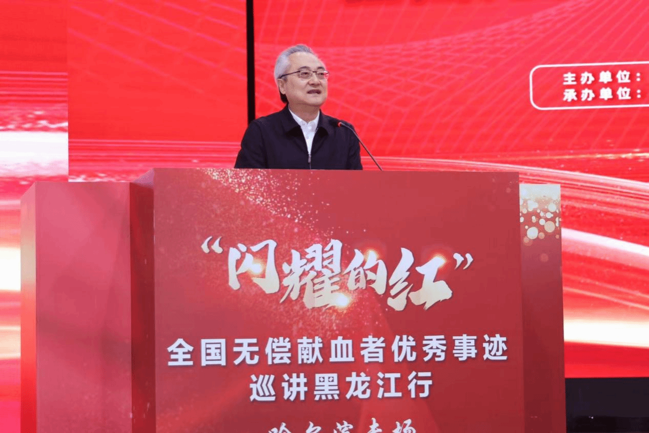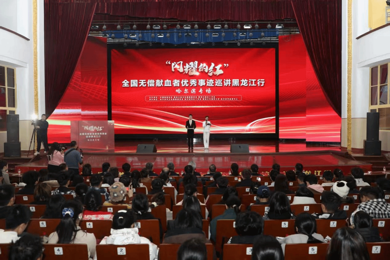 10月26日下午,由中国输血协会、黑龙江省卫生健康委员会、黑龙江省红十字会共同主办,哈尔滨市卫生健康委员会、哈尔滨市红十字会、黑龙江中医药大学与黑龙江省血液中心(哈尔滨市血液中心)联合承办的2025“闪耀的红”—全国无偿献血者优秀事迹巡讲黑龙江哈尔滨专场活动在黑龙江中医药大学主楼礼堂举行。省市相关单位领导、全国巡讲团成员、百次献血者代表、学校师生近千人齐聚一堂,共同聆听热血故事,感受奉献力量。中国输血协会理事长朱永明,中国输血协会献血动员专业委员会主任委员、协会常务理事、江苏省输血协会理事长丁文艺,中国输血协会秘书长刘青宁,黑龙江中医药大学党委书记赵炜明,黑龙江省卫生健康委党组成员、副主任、省疾病预防控制局党组书记、局长、一级巡视员方庆伟,黑龙江省红十字会党组成员、秘书长苗利,哈尔滨市红十字会党组书记、常务副会长陈琳,哈尔滨市卫生健康委员会党委书记、主任杜平,黑龙江省卫生健康委员会医疗应急与安全生产办公室主任蔡昕,哈尔滨市血液中心党总支书记、主任刘颖出席活动。