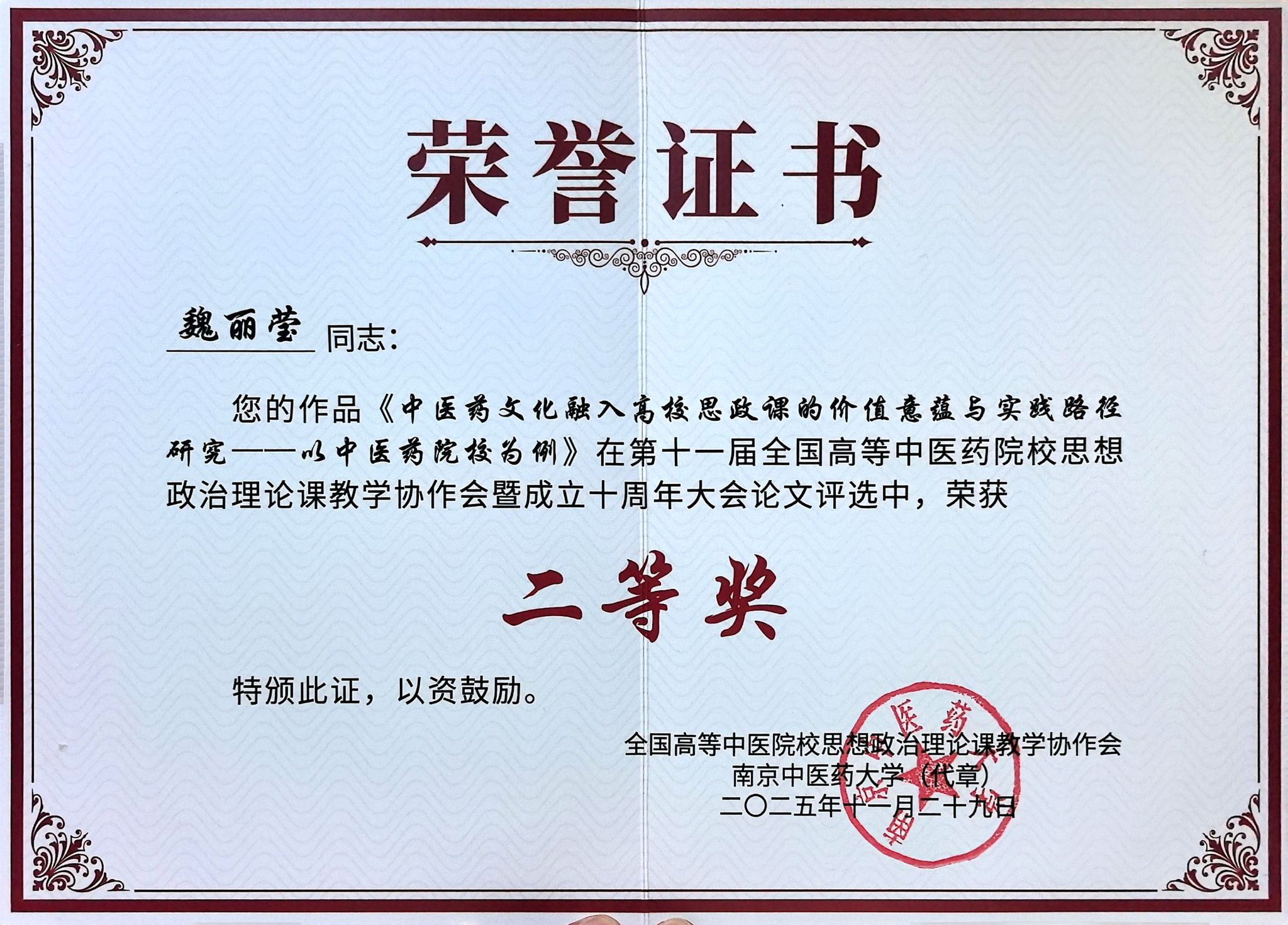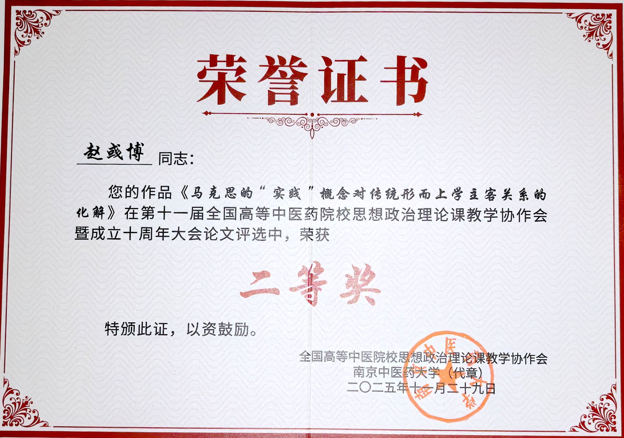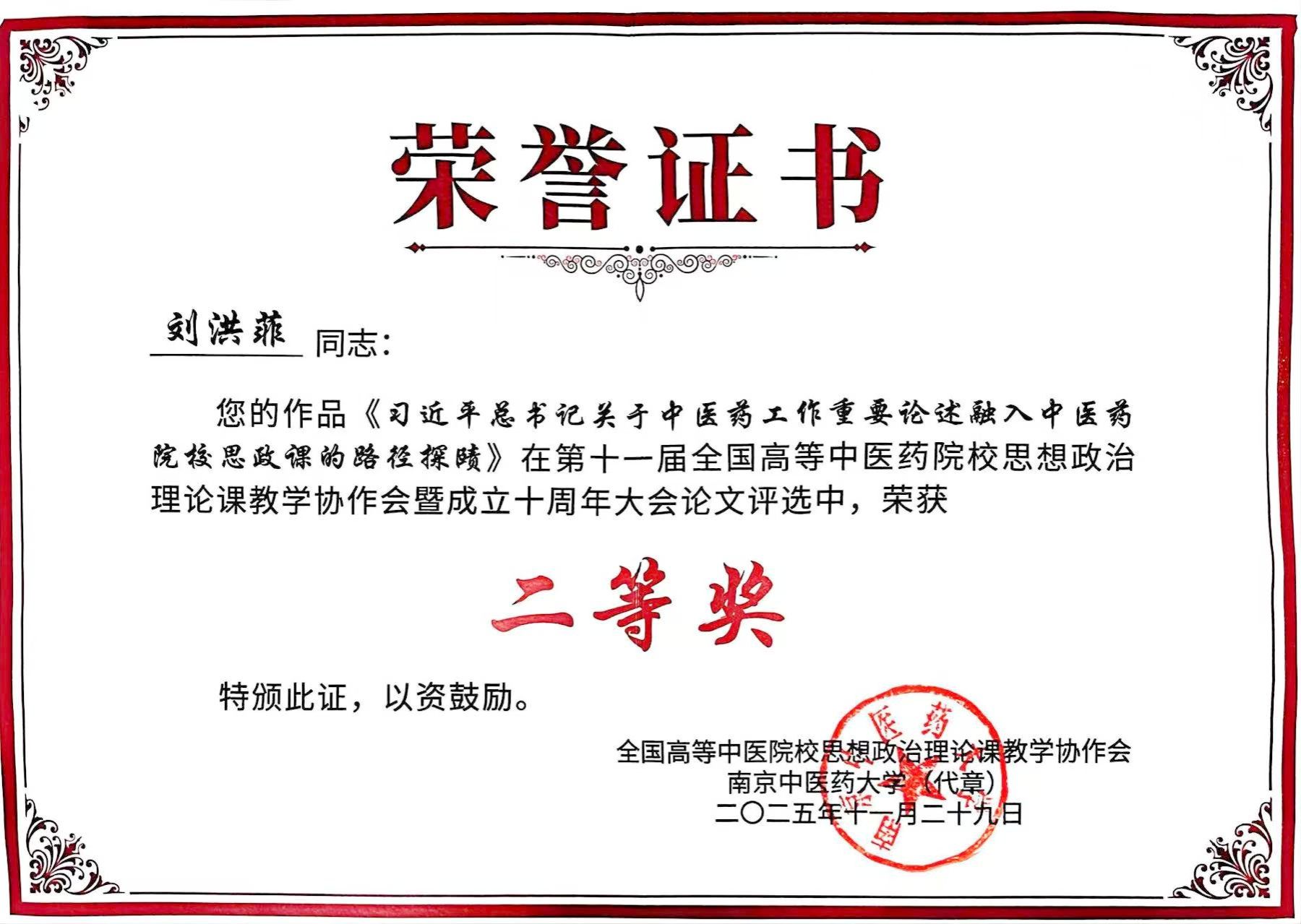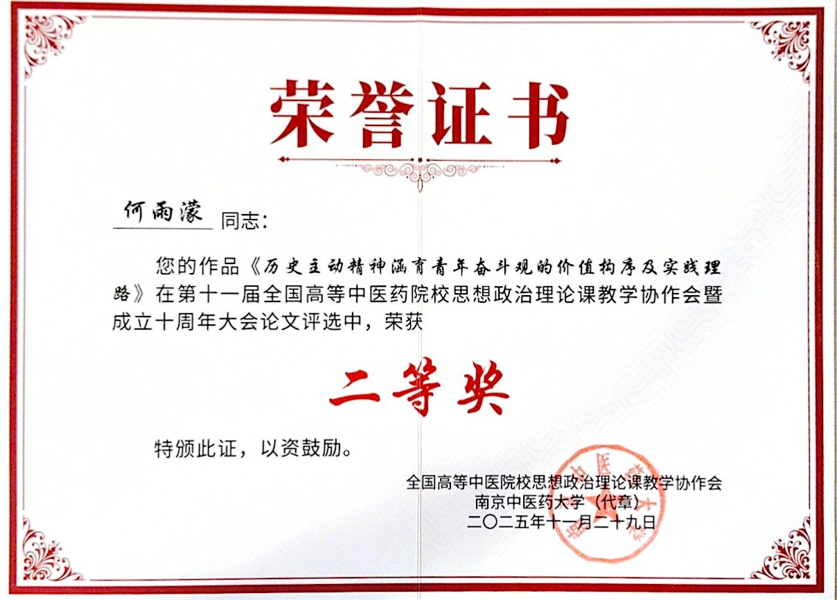 马克思主义学院教师何雨濛的论文《历史主动精神涵育青年奋斗观的价值构序及实践理路》、魏丽莹的论文《中医药文化融入高校思政课的价值意蕴与实践路径研究——以中医药院校为例》、刘洪菲的论文《习近平总书记关于中医药工作重要论述融入中医药院校思政课的路径探赜》、赵彧博的论文《马克思的“实践”概念对传统形而上学主客关系的化解》在大会论文评选中荣获二等奖。