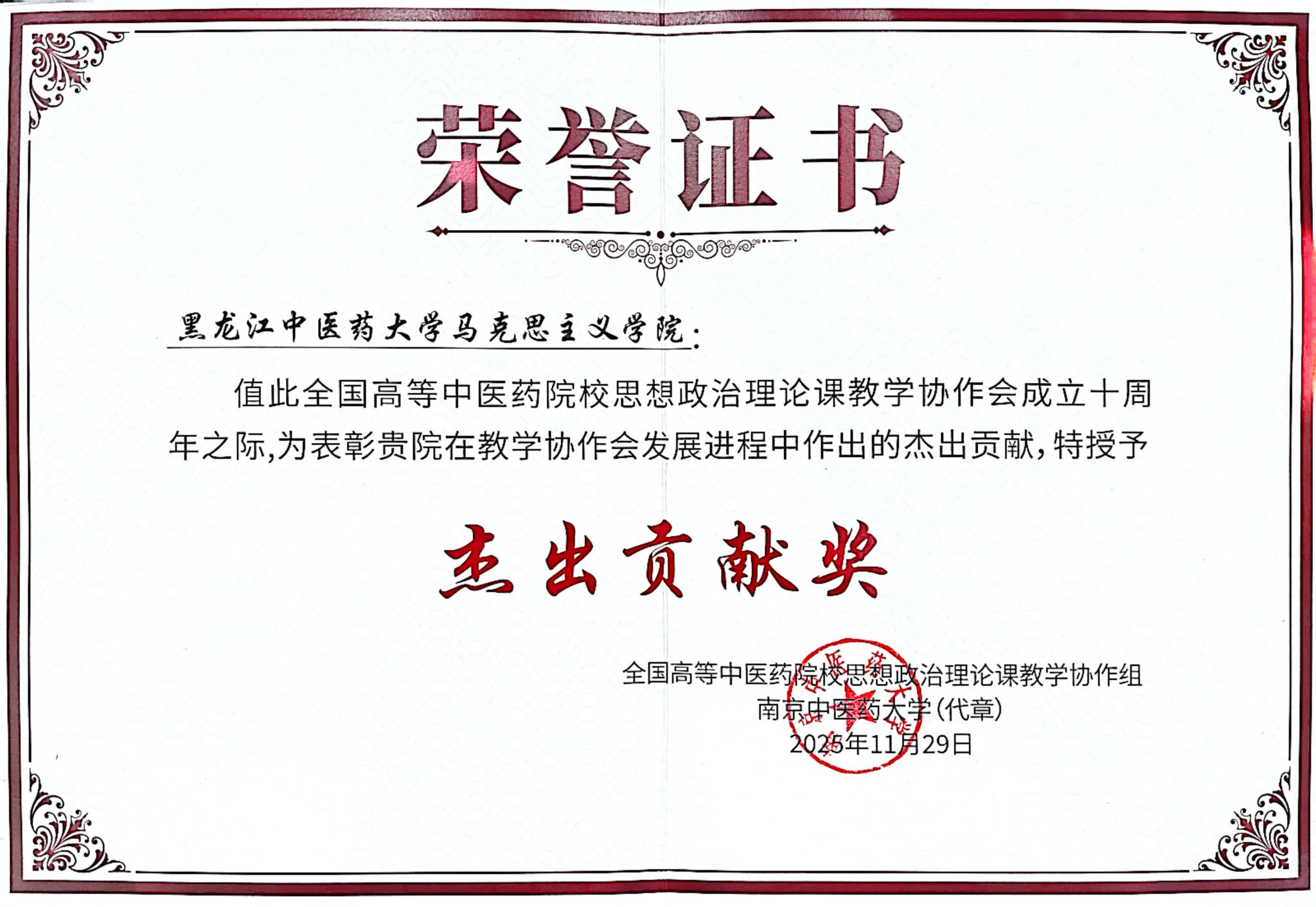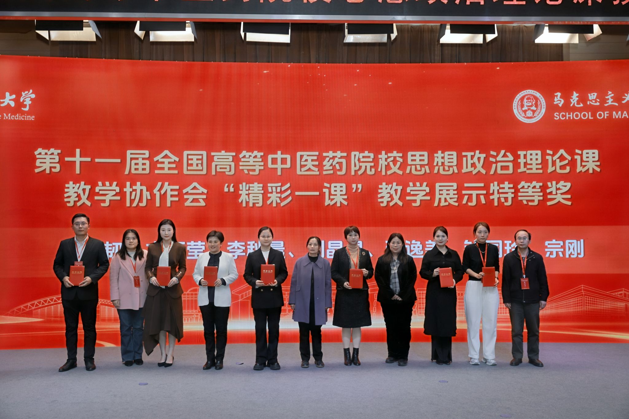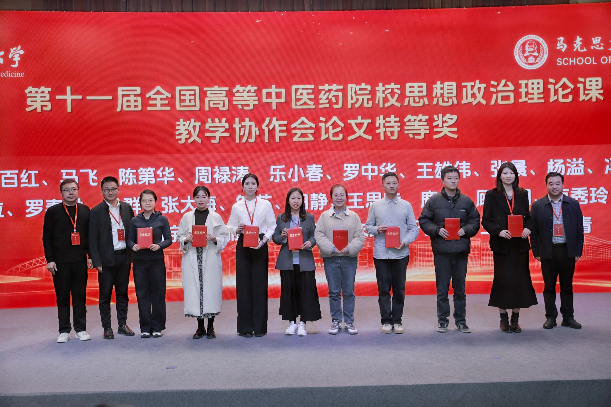 11月29日至30日,全国高等中医药院校思想政治理论课建设经验交流会暨第十一届教学协作会议在南京中医药大学召开。本次会议以“学习贯彻习近平总书记对学校思政课建设的重要指示精神,坚持‘两个结合’,突出中医药文化特色,推动思政课内涵式发展”为主题,来自全国25所中医药院校的280余位专家学者参会。我校教师在大会“精彩一课”教学展示环节荣获特等奖1项,在大会论文评选中荣获特等奖1项、二等奖4项。我校马克思主义学院被授予“杰出贡献奖”。