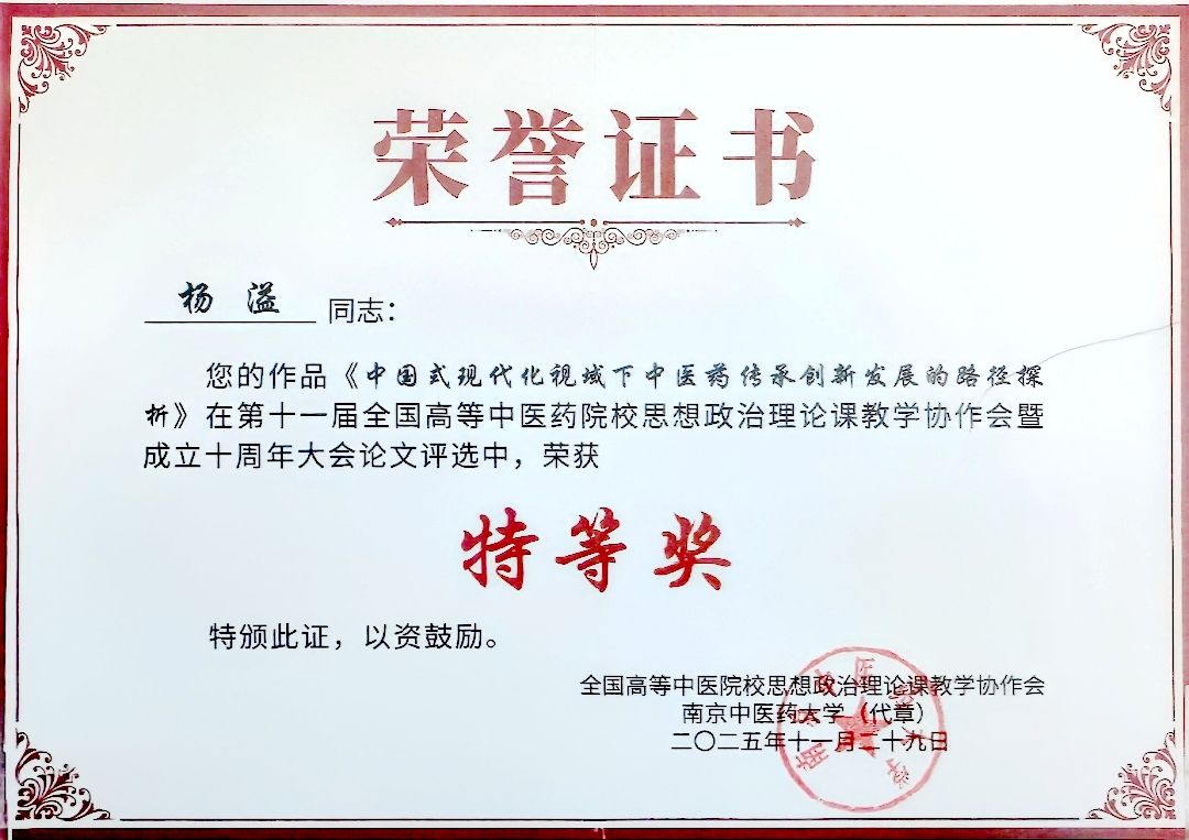 马克思主义学院教师杨溢的论文《中国式现代化视域下中医药传承创新发展的路径探析》在大会论文评选中荣获特等奖。