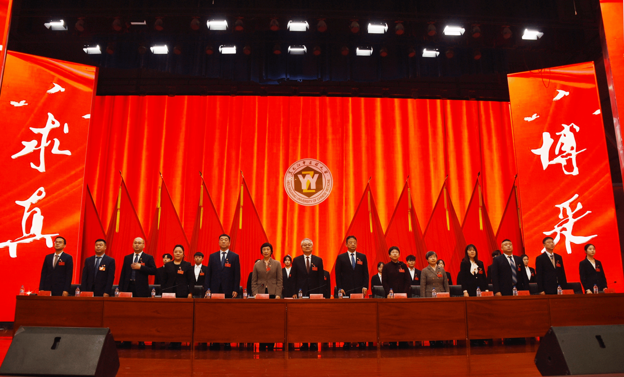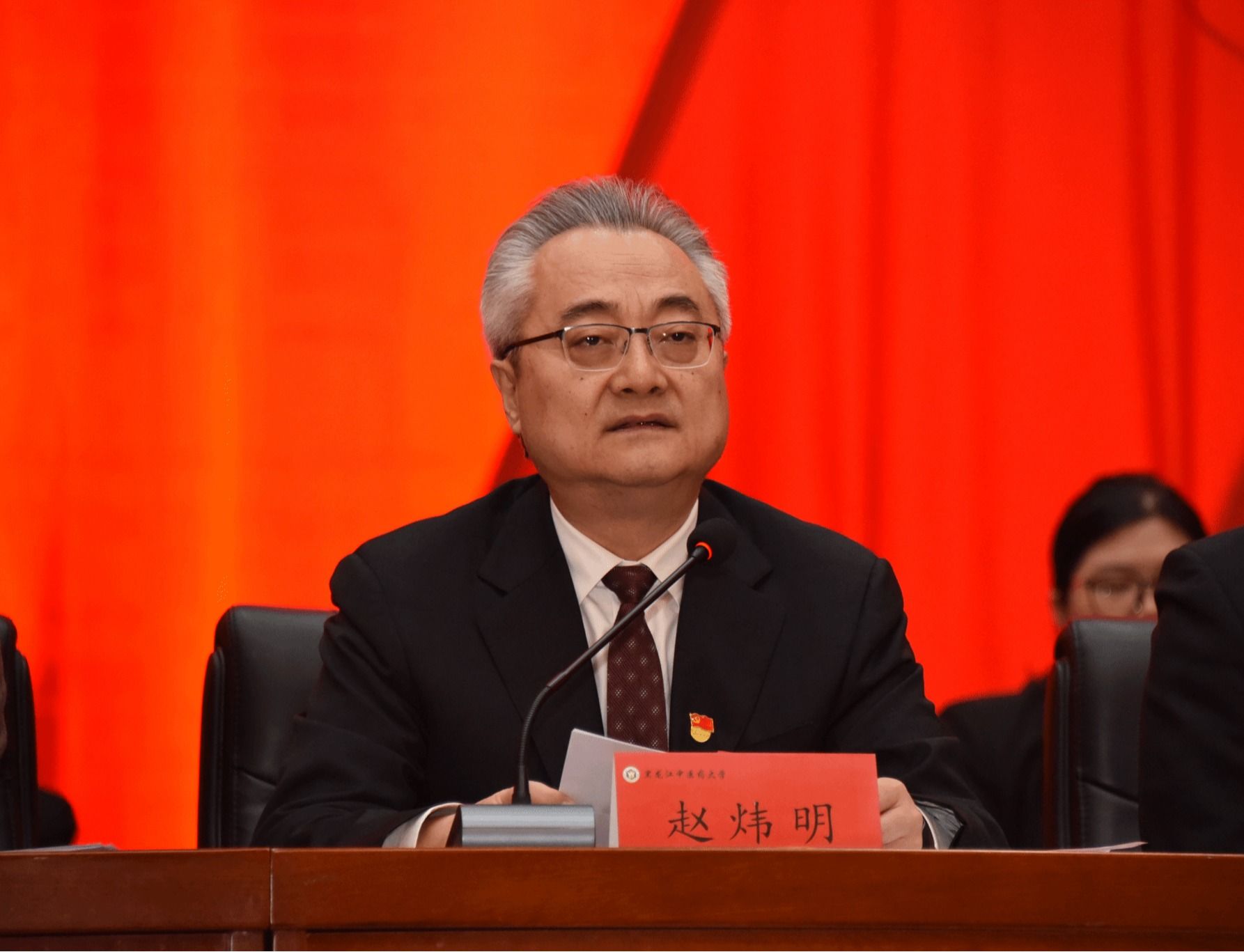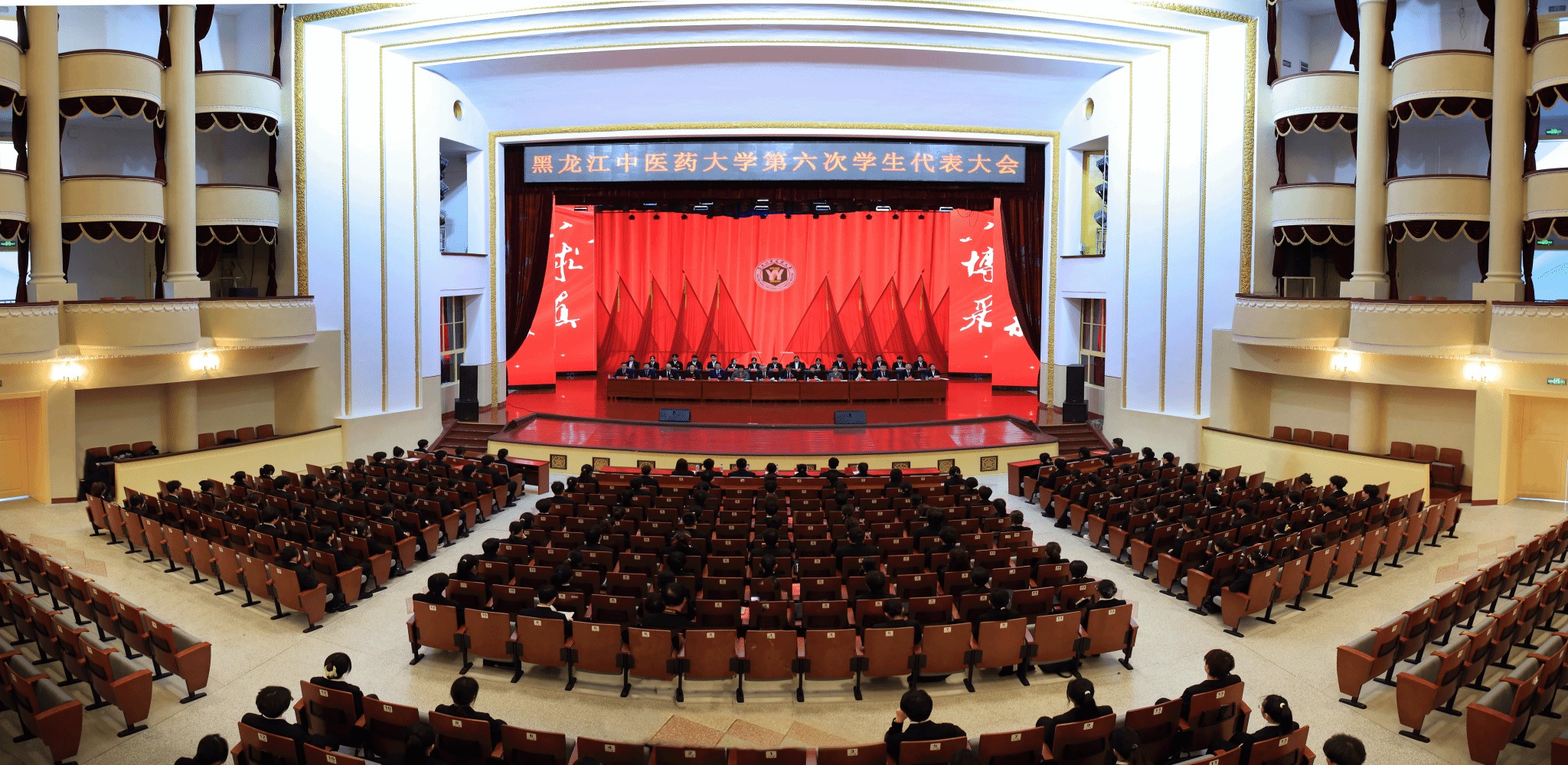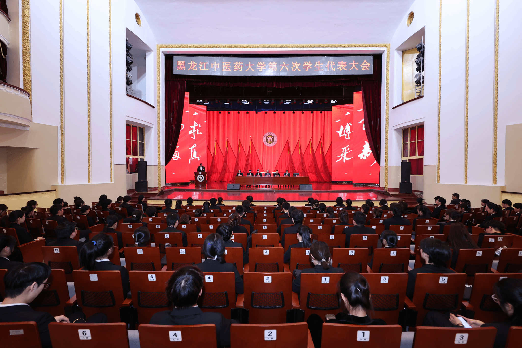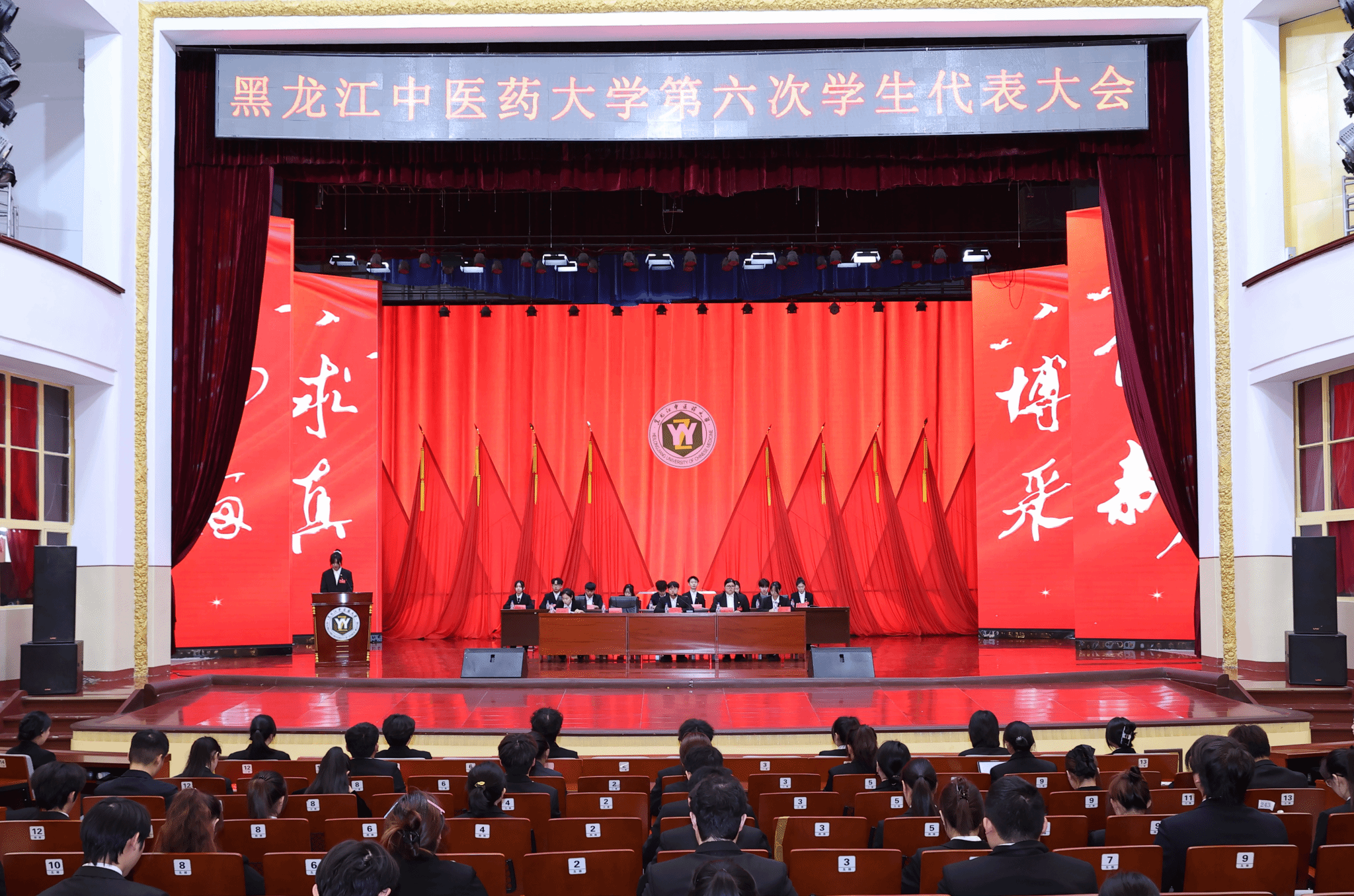 12月5日9时,黑龙江中医药大学第六次学生代表大会第一次全体会议在庄严的国歌声中开幕。赵炜明讲话、郭宏伟致辞,乔广霞主持大会开幕式,校团委副书记刘译阳宣读省学联及校党委《关于同意召开黑龙江中医药大学第六次学生代表大会的批复》。省学联驻会执行主席刘懿致辞、哈尔滨工程大学校学生会主席团成员王佳怡代表兄弟高校学生会致辞。