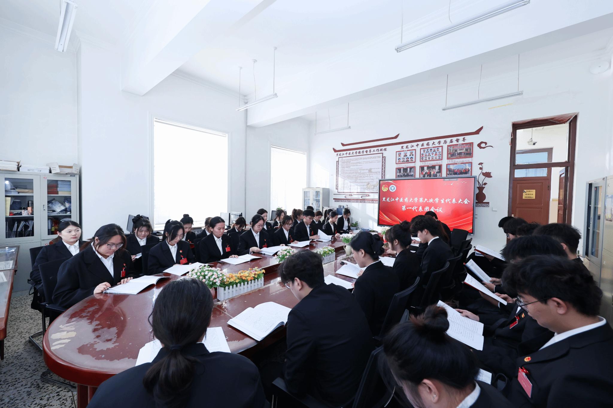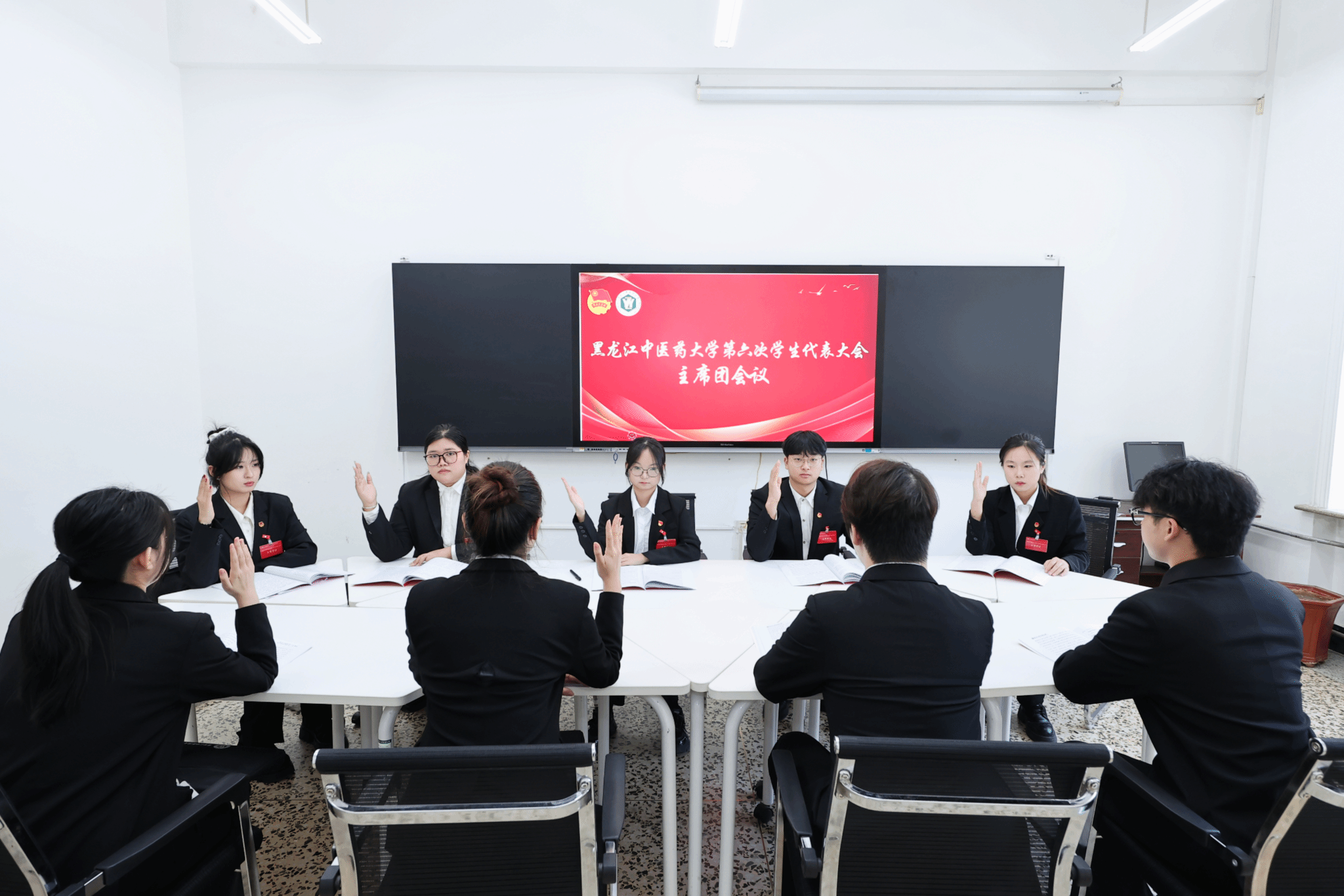 分组讨论结束后,召开了大会主席团会议,汇总《黑龙江中医药大学2024—2025年度学生委员会工作报告(草案)》和《黑龙江中医药大学学生会章程(修订案)》的讨论意见。