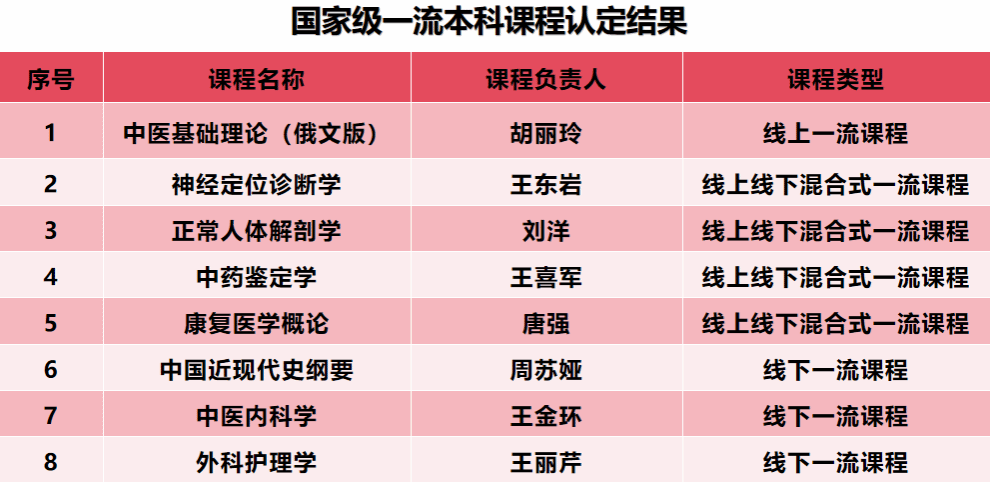 12月23日,第三批国家级一流本科课程名单正式揭晓。我校有8门课程成功入选国家级一流本科课程,包括1门线上课程、4门线上线下混合课程以及3门线下课程,入选数量在全国中医药院校中位居前列。