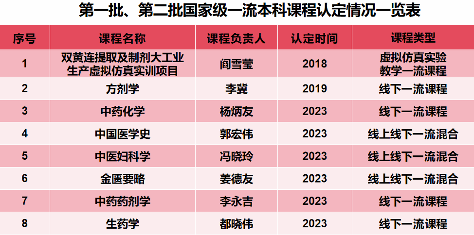 近年来,学校以“双万计划”为引领,已建成国家级一流本科课程16门、省级一流本科课程29门、校级一流本科课程75门。获批的16门国家级一流课程涵盖我校中医学、针灸推拿学、中西医临床医学、中药学、药学、护理学、康复治疗学等国家级一流本科专业建设点。一直以来,学校坚持以学生为中心、以产出为导向,强化课程内涵建设,打造更多具有高阶性、创新性与挑战度的“金课”,助力一流本科教育实现高质量发展。