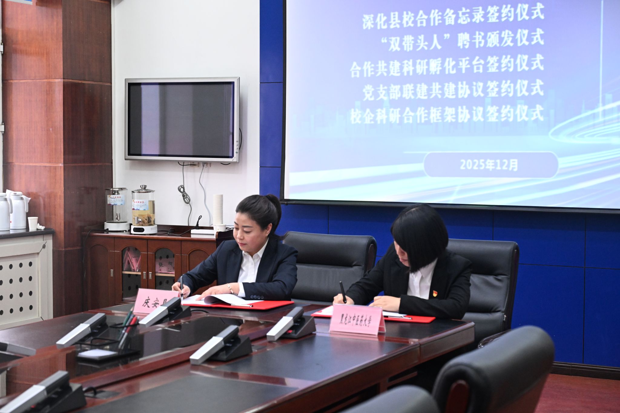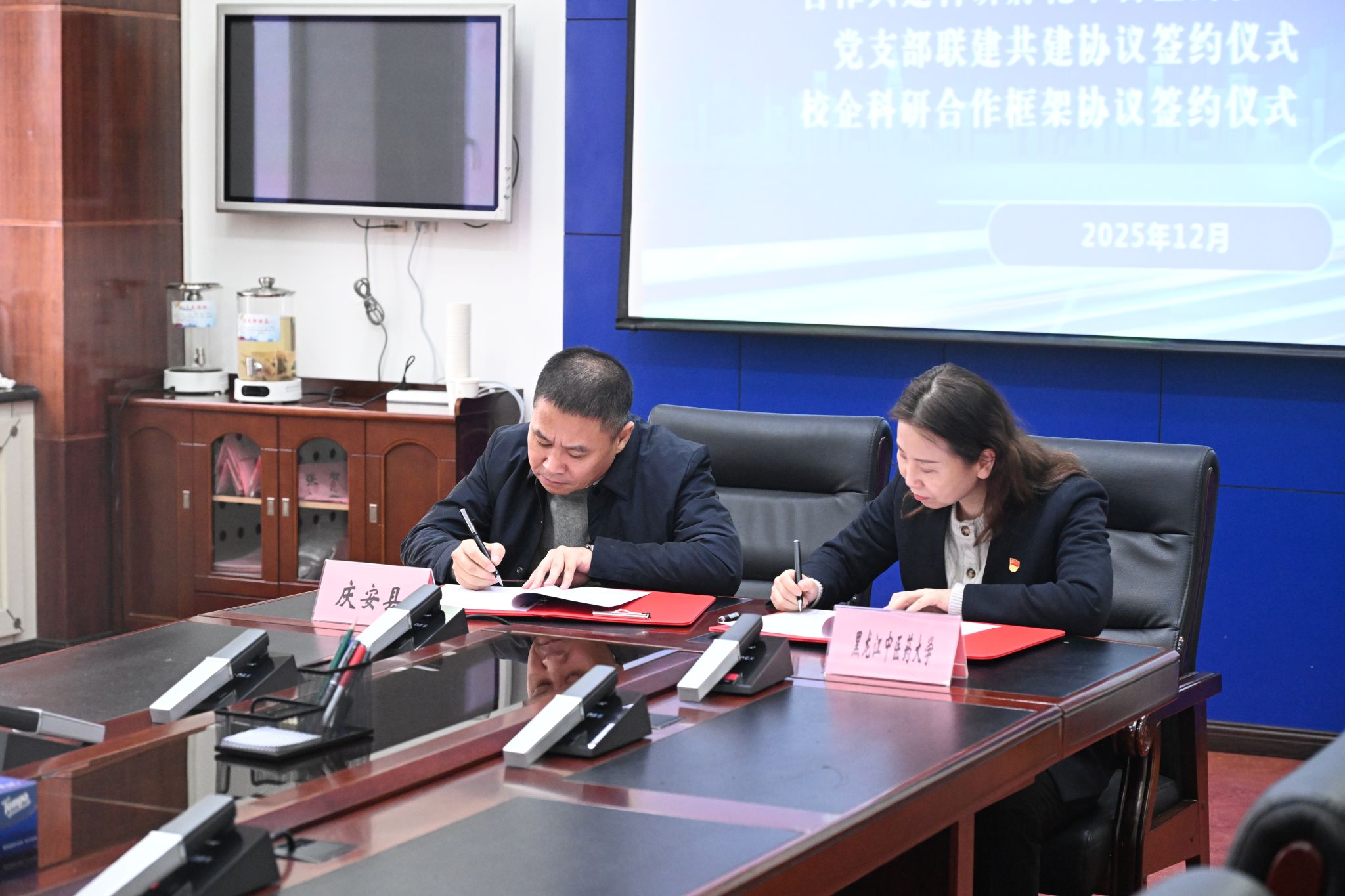 随后,庆安县与我校共同签订县校合作备忘录,并为“双带头人”刘艳、耿乃志教授颁发“县级顾问”聘书;县工信局与药学院签约共建科研孵化平台,县中医医院院直党支部与第一临床医学院二内党支部达成联建协议,黑龙江鑫乐泰农林科技有限公司与刘艳教授签订科研合作框架协议。