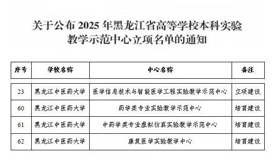 近日,黑龙江省教育厅发布了《关于公布2025年黑龙江省高等学校本科实验教学示范中心立项名单的通知》。在2025年高等学校本科实验教学示范中心遴选中,我校医学信息技术与智能医学工程实验教学示范中心获批省级立项建设;药学类专业实验教学示范中心、中药学类专业虚拟仿真实验教学示范中心、康复医学实验教学中心获批省级培育建设,总立项数量位居省内所有高校第二名,彰显我校扎实的建设成效。此次4个省级中心的立项标志着我校实验教学体系建设迈上新台阶。