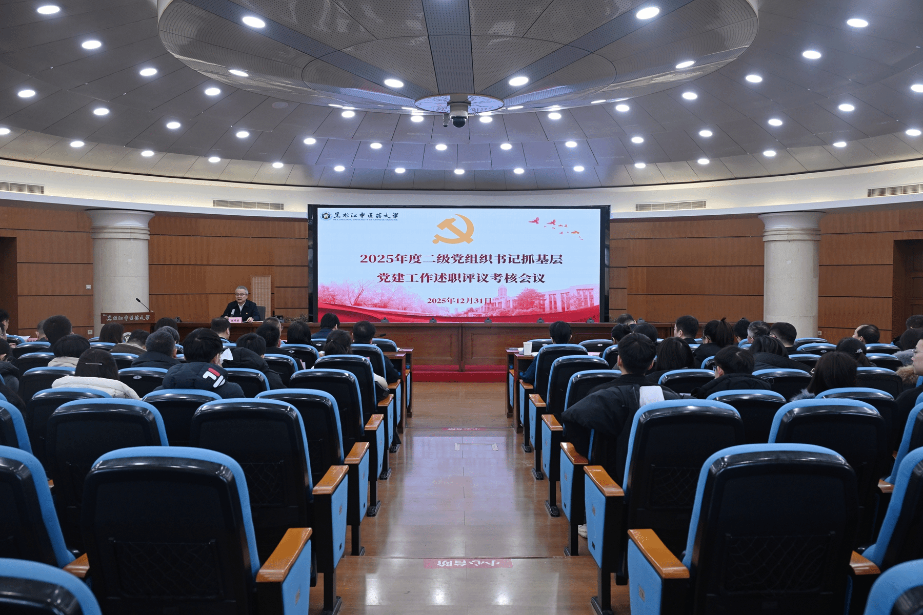 2025年12月31日下午,学校在主楼求真讲堂召开2025年度二级党组织书记抓基层党建工作述职评议考核会议。学校党委书记赵炜明主持会议并作总结讲话。学校领导班子成员、机关党群部门主要负责人、各二级党组织书记及基层党支部书记、师生党员代表参加会议,对各二级党组织书记的述职情况进行考核测评。