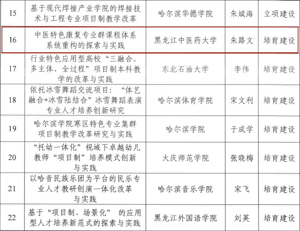 近日,省教育厅公布“黑龙江省项目制教育教学改革培育建设项目”遴选结果,我校《中医特色康复专业群课程体系系统重构的探索与实践》项目名列其中。