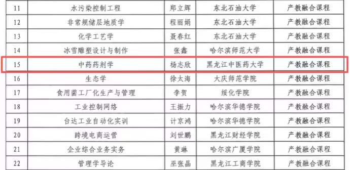 近日,黑龙江省教育厅公布了首批优质本科课程认定结果,我校药学院杨志欣教授主持的《中药药剂学》课程被认定为省级“产教融合课程”,入选黑龙江省首批优质本科课程。