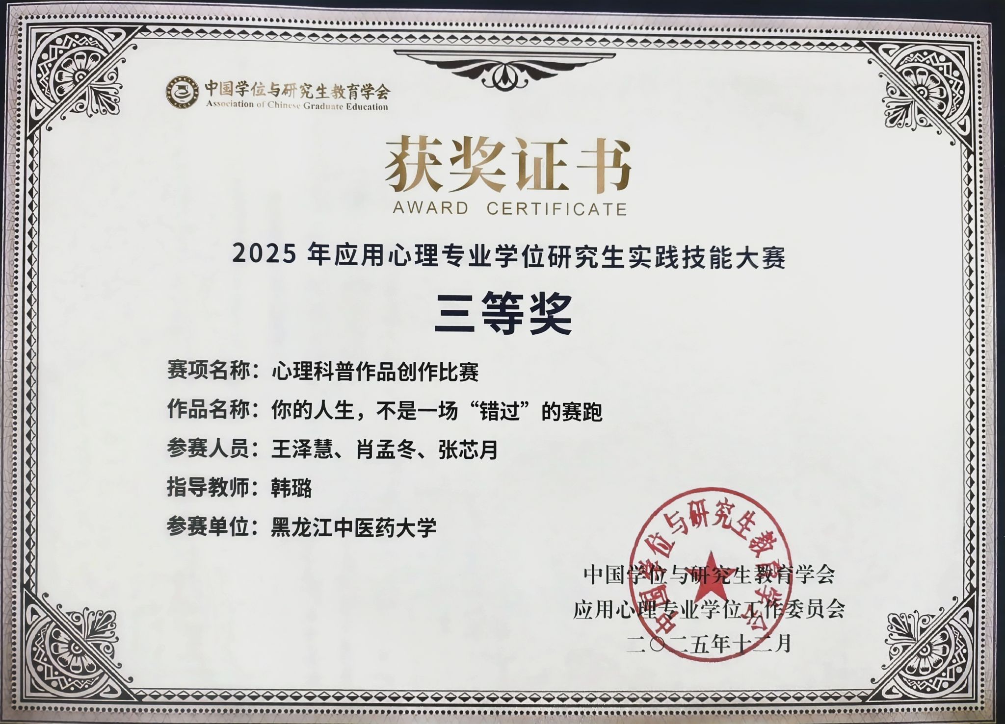 我校作为首次参赛队伍,积极报名参赛。最终,人文与管理学院2025级应用心理专业硕士王泽慧、肖孟冬、张芯月(指导教师:韩璐)在激烈竞争中脱颖而出,获“心理科普作品创作比赛”项目三等奖。