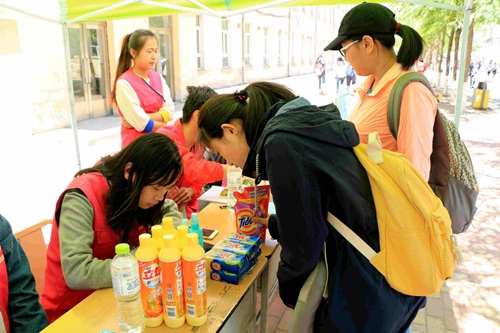在活动现场,后勤管理处工作人员和学生志愿者设立宣传展板向过往的师生介绍我校“爱心之家”的详细情况,并为持有贫困证明、绿色通道证明或“爱心卡”的同学免费发放生活用品。还向即将毕业的同学们征集书籍和衣物。