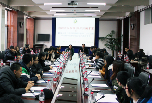 为进一步加强师生间的沟通交流,了解学生的实际情况,更好地开展外语教学,12月22日下午,公共外语教研部在主楼二楼会议室召开以“和谐共促发展、师生共赢未来”为主题的师生座谈会,组织该部全体教师与各学院学生辅导员及学生代表就我校外语教学工作进行交流。公共外语教研部主任李秋红、教务处副处长王烨燃参加座谈交流。