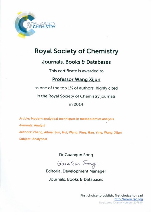 我校王喜军教授科技团队发表的文章在2014年皇家化学杂志被引用排名进入前百分之一,英国皇家化学会特颁证书予以表彰。